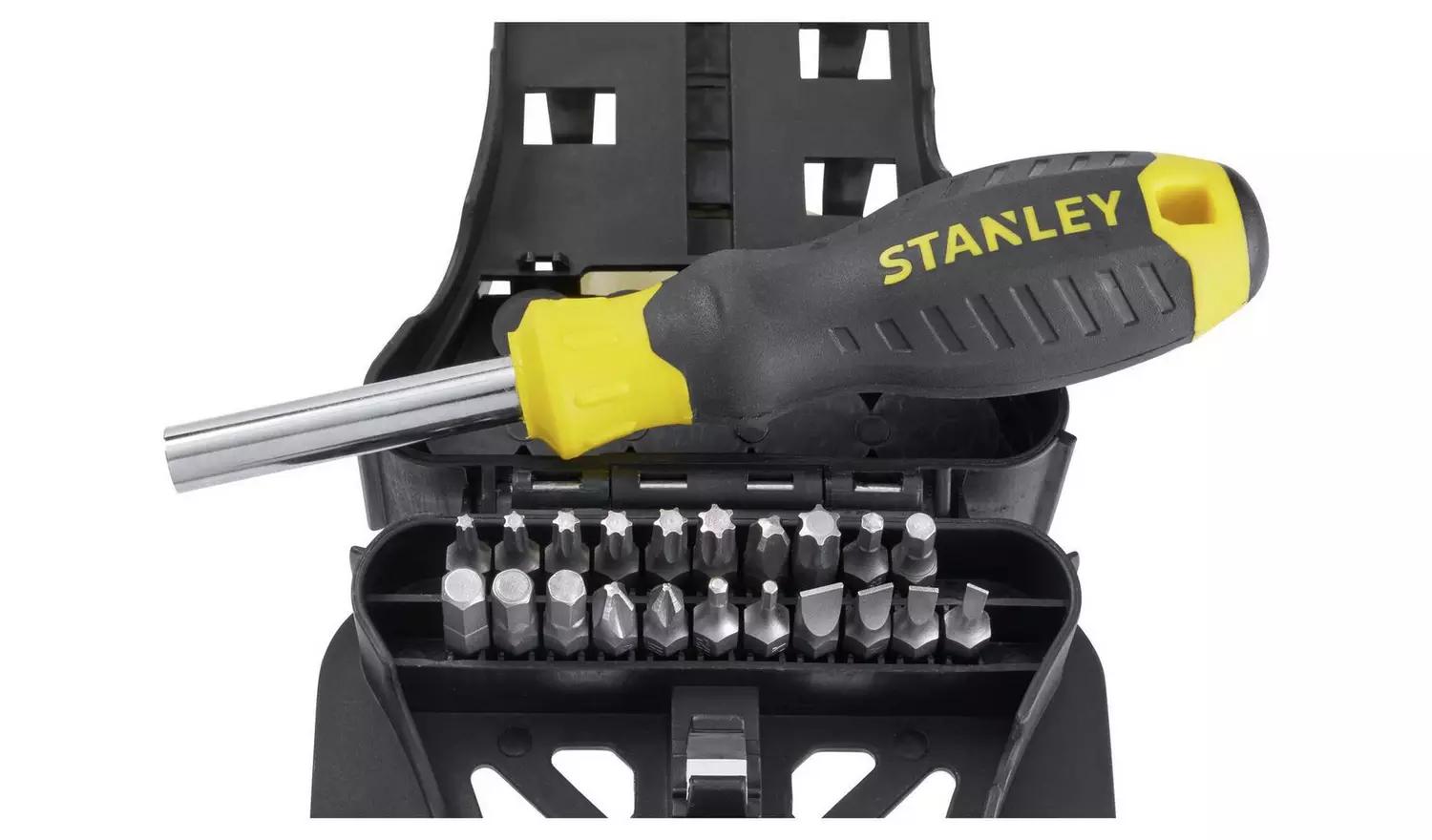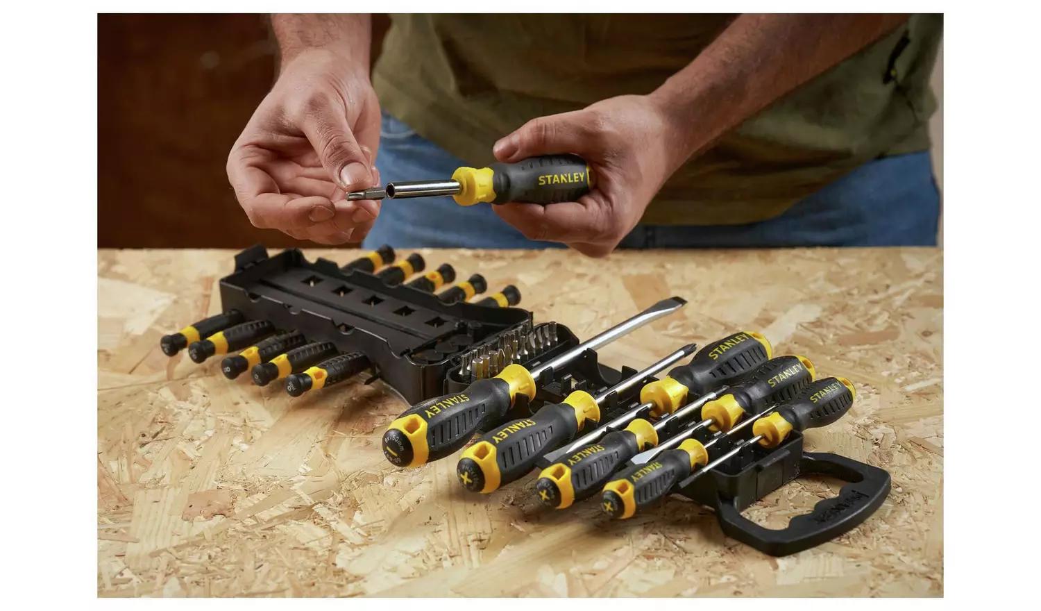 The Stanley 40-Piece Screwdriver Set includes a variety of slotted, Phillips, precision, and Torx screwdrivers, plus a multi-bit screwdriver with various bits. Made from durable chrome vanadium steel with hardened black oxidized tips, these tools ensure long-lasting strength. Features include large, soft-grip handles for comfort and a molded handle-to-bar connection for easier turning. Perfect for home and professional use, it comes in a custom storage case for easy organization.