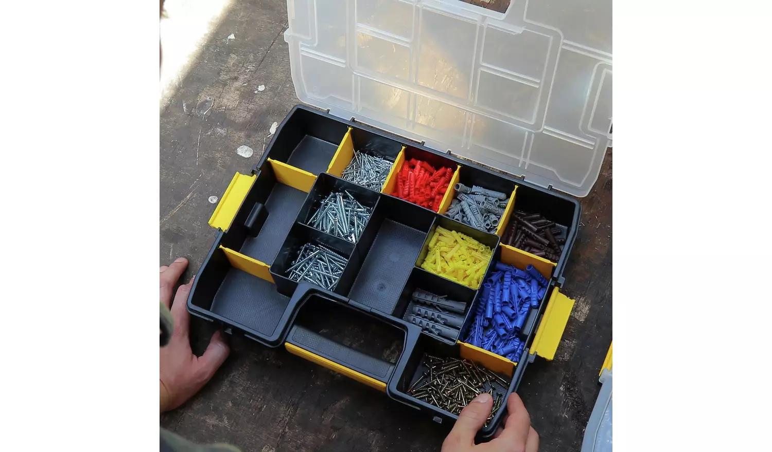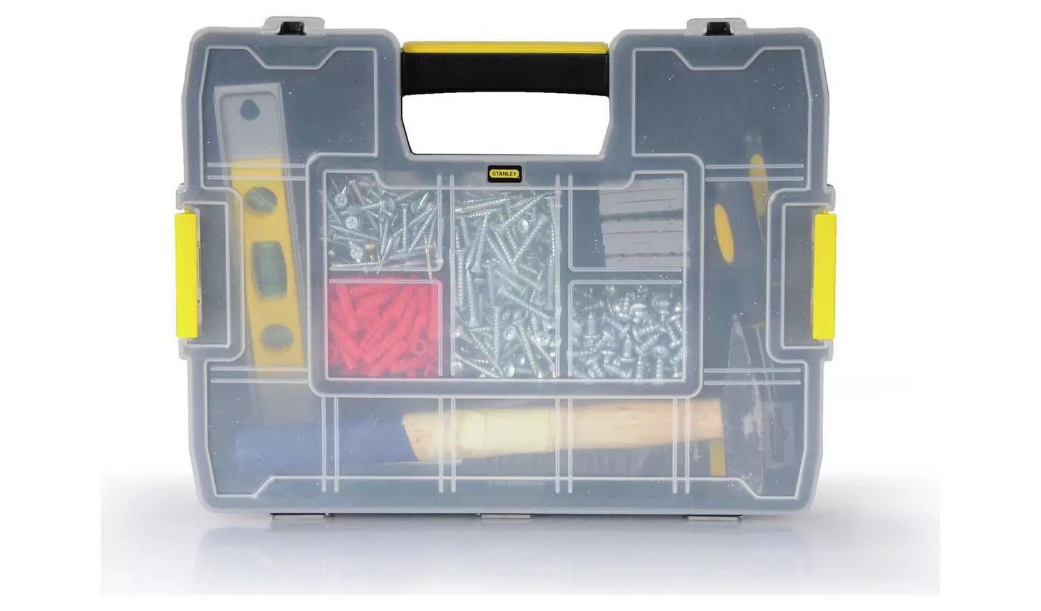The Stanley Sortmaster Junior Organiser offers customisable storage with 14 compartments and removable dividers. Its see-through lid provides full visibility, while the interlocking design prevents spills. Multiple organisers can be clipped together for expanded storage.