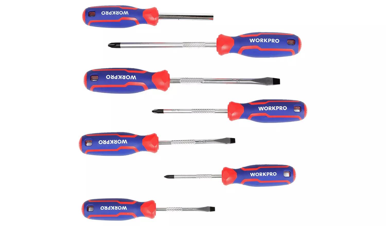 Tackle DIY jobs with the WORKPRO 56 Piece Screwdriver Set, made from tough steel. Strong magnetic tips keep screws secure during work, so you won't drop or lose screws. Comfortable handles with a non-slip grip make longer projects easier. Each tool has clear size markings for quick identification. The set includes precision screwdrivers, 40 interchangeable bits, and a magnetizer/demagnetizer, all stored in a practical carry case. Treated to resist rust.
