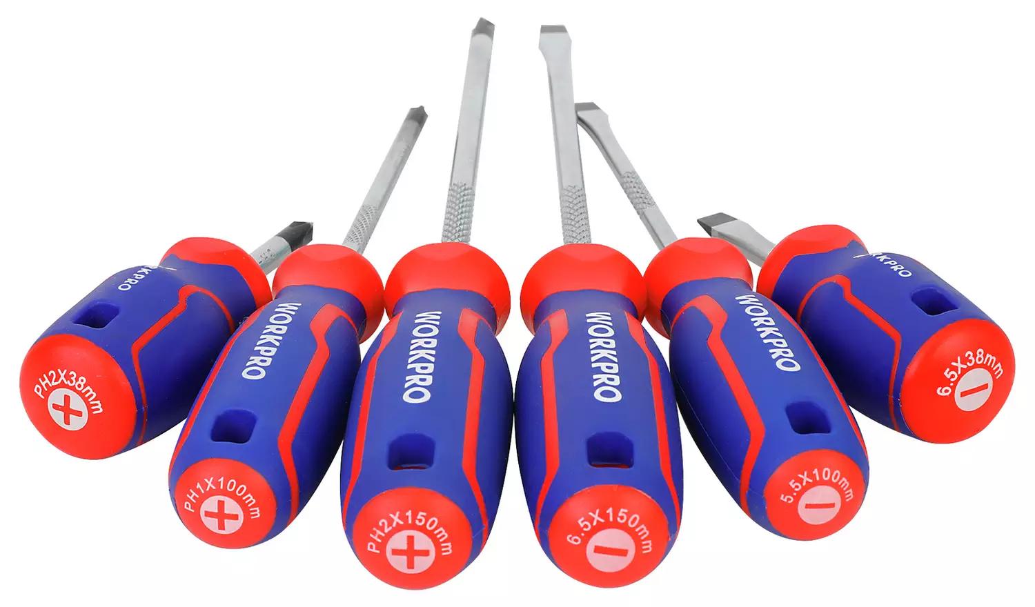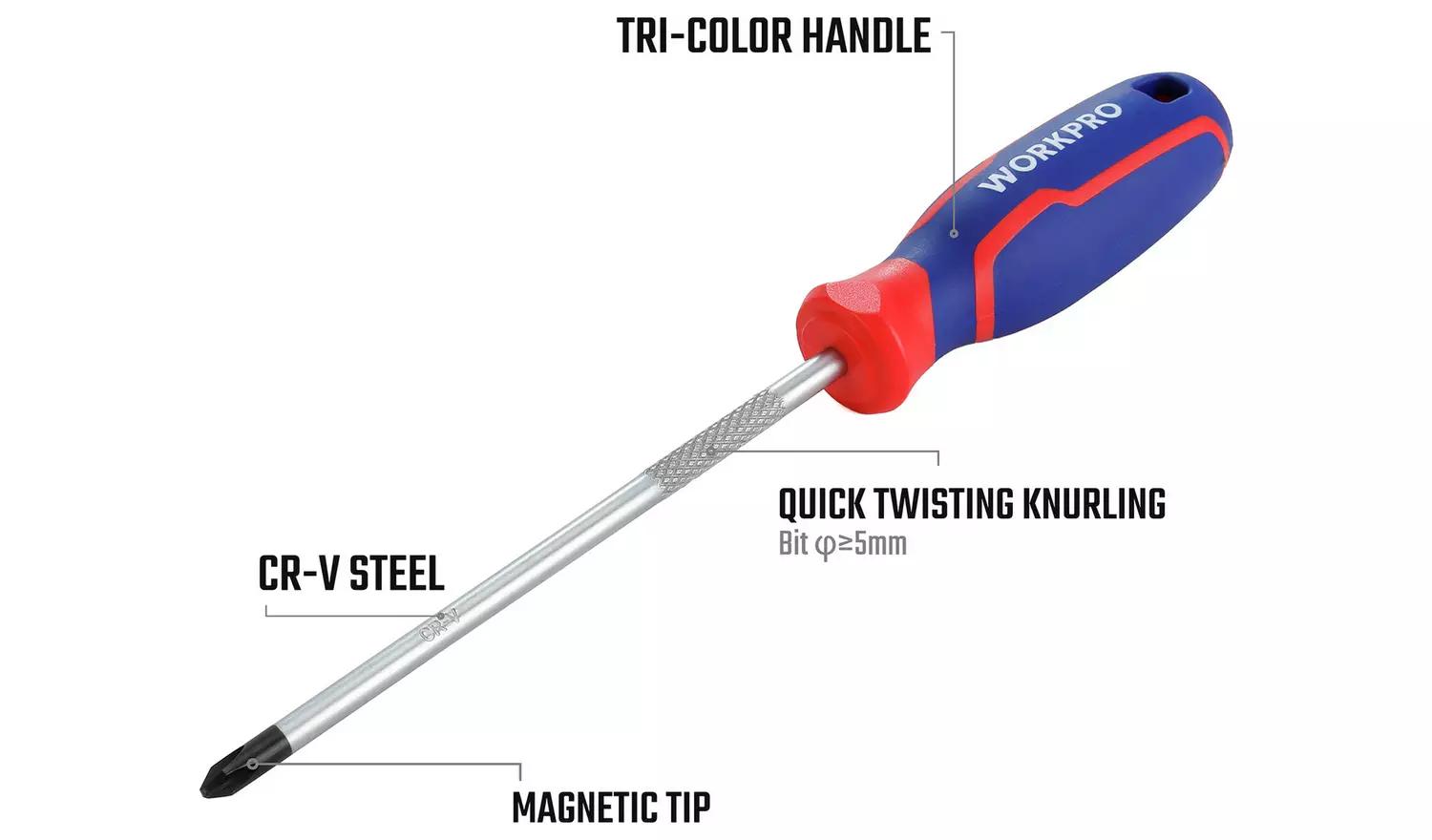 Complete everyday DIY tasks with the WORKPRO 6-piece screwdriver kit, featuring strong magnetic tips that prevent screws from falling or getting lost. The ergonomic handles have anti-slip particles for comfortable grip during precision projects. Made from high-quality chrome vanadium steel with heat treatment for durability, corrosion resistance and long-lasting performance.